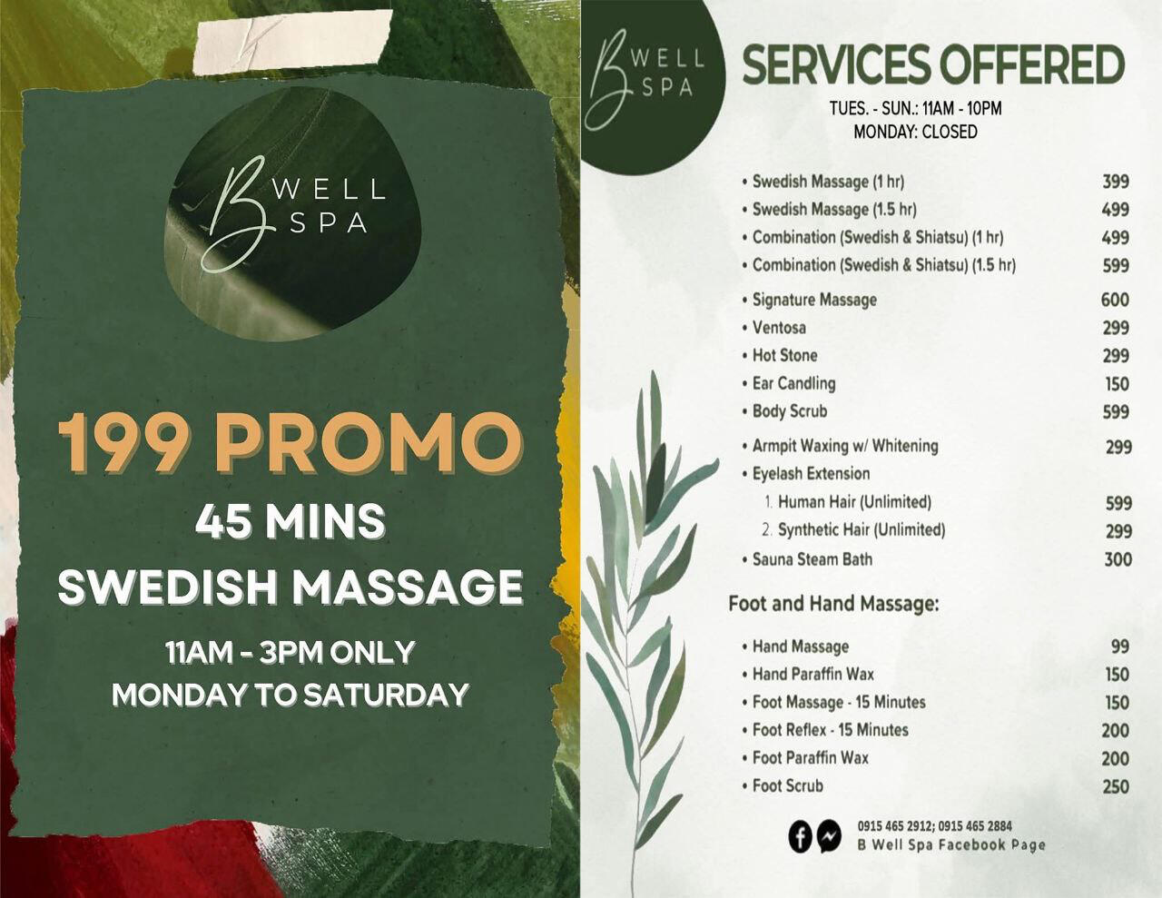 Our β±199 Massage Promo is available only from 11 AM β 3 PM.β‘ 5. Do you accept walk-ins?